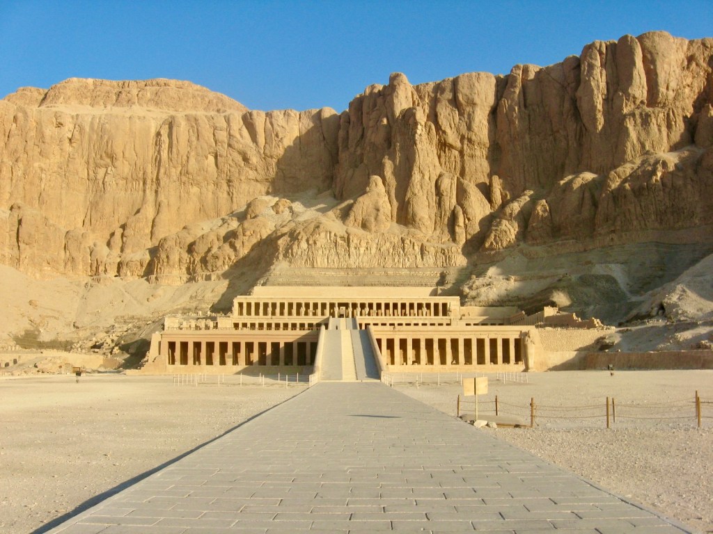 One of Egypt’s most famous sites is the Mortuary Temple of Hatshepsut, located in Deir el-Bahri, on the West Bank of the Nile River near the entrance to what now is called the Valley of the Kings. It is set against the bottom side of a mountain. The right angles and sharp lines of her temple make it even more striking in this setting, which I’m guessing is what she had in mind. It was found under millennia of sand, and it had to be reconstructed, but today we can see it as it was intended. A grand and majestic, multi-tiered complex nestled into the side of the mountain. Almost daring to defy the ones who tried to erase her.