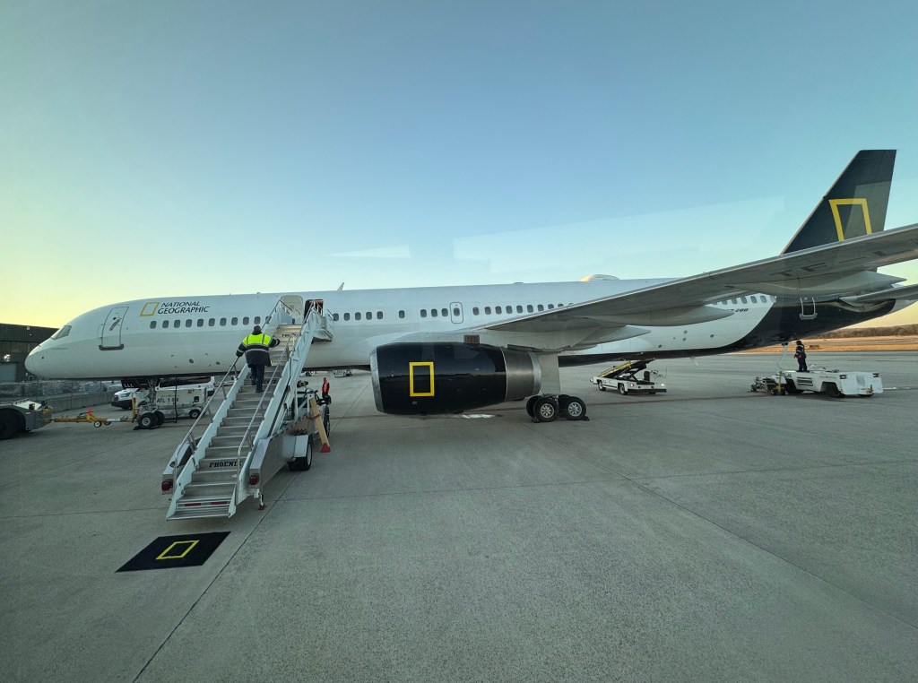 Our aircraft was a Boeing 757-200 operated by Icelandair. The seats were reconfigured in VIP two-by-two formation, allowing a maximum of 75 guests. We lucked out with only 35 guests (not including the flight crew or NG staff). This allowed our group to spread out on the jet. So much so that I regularly stretched in the emergency exit row when my hips were cranky. I even managed a downward dog when I thought no one was looking.